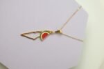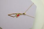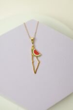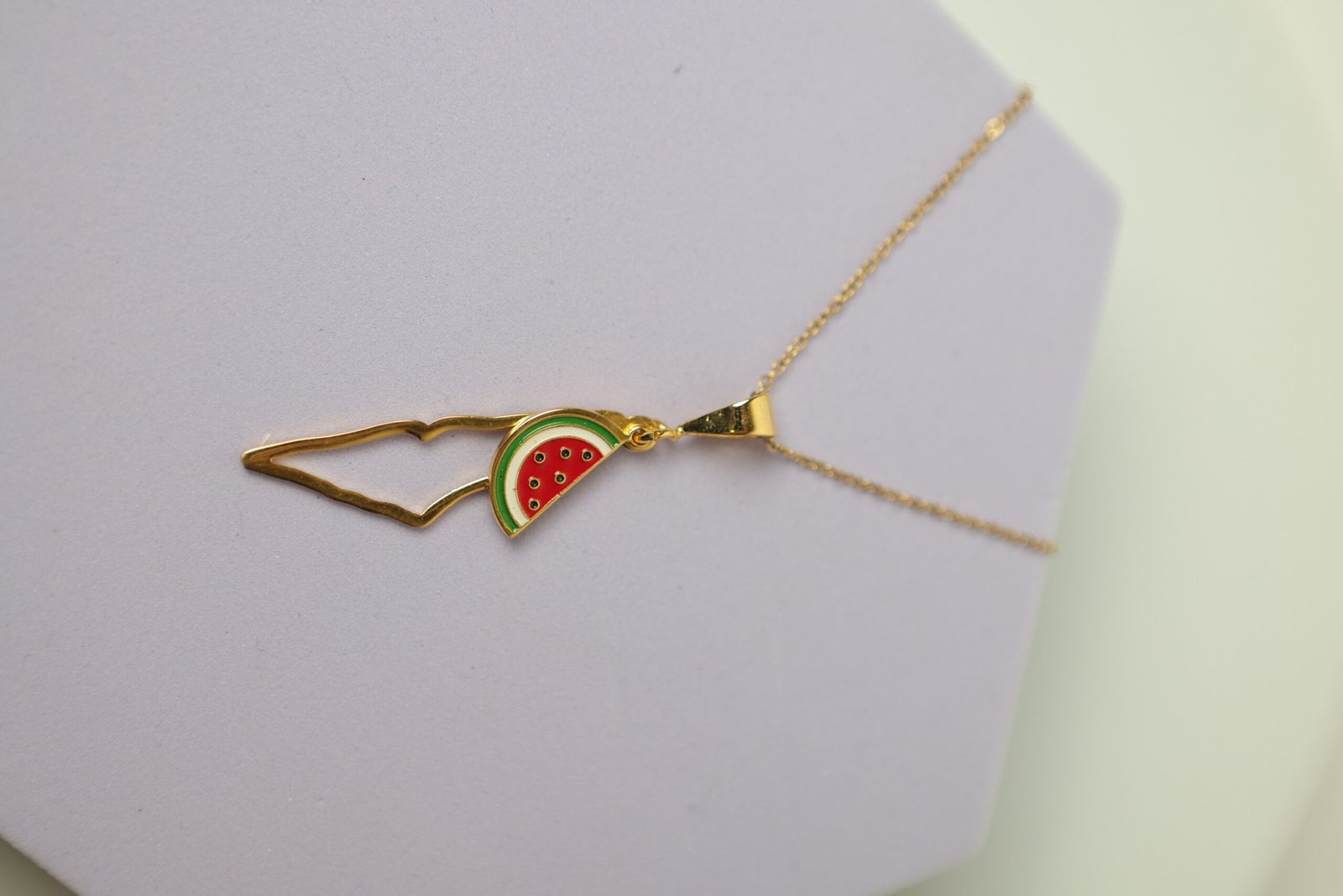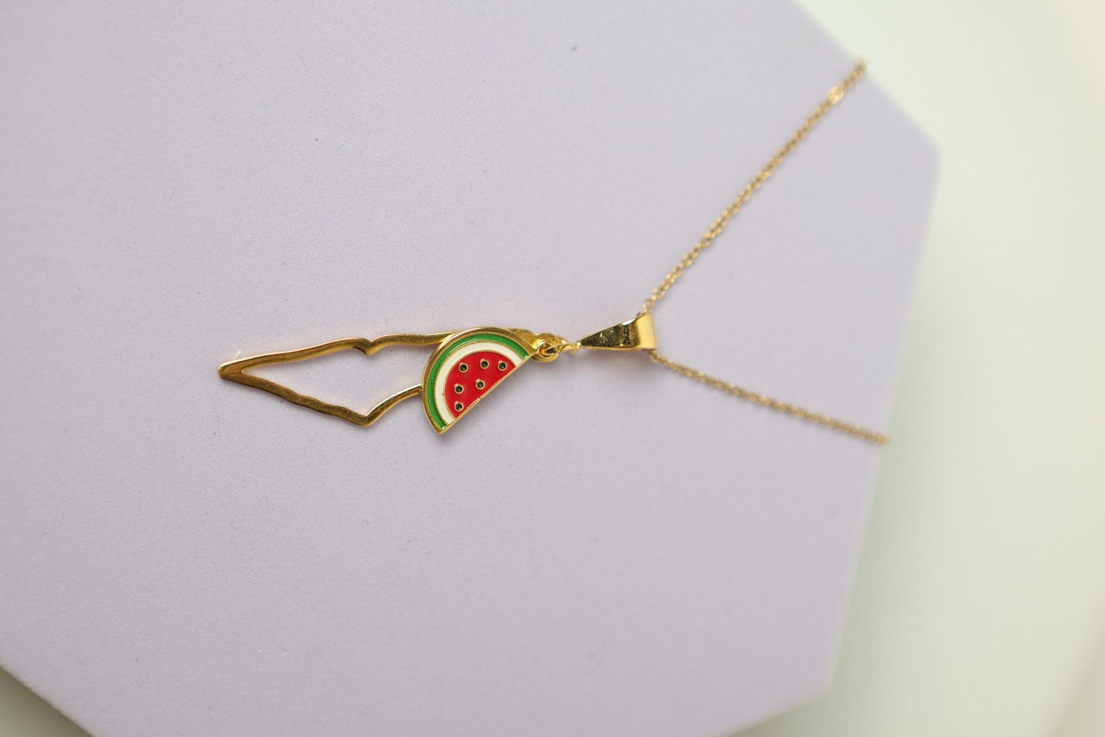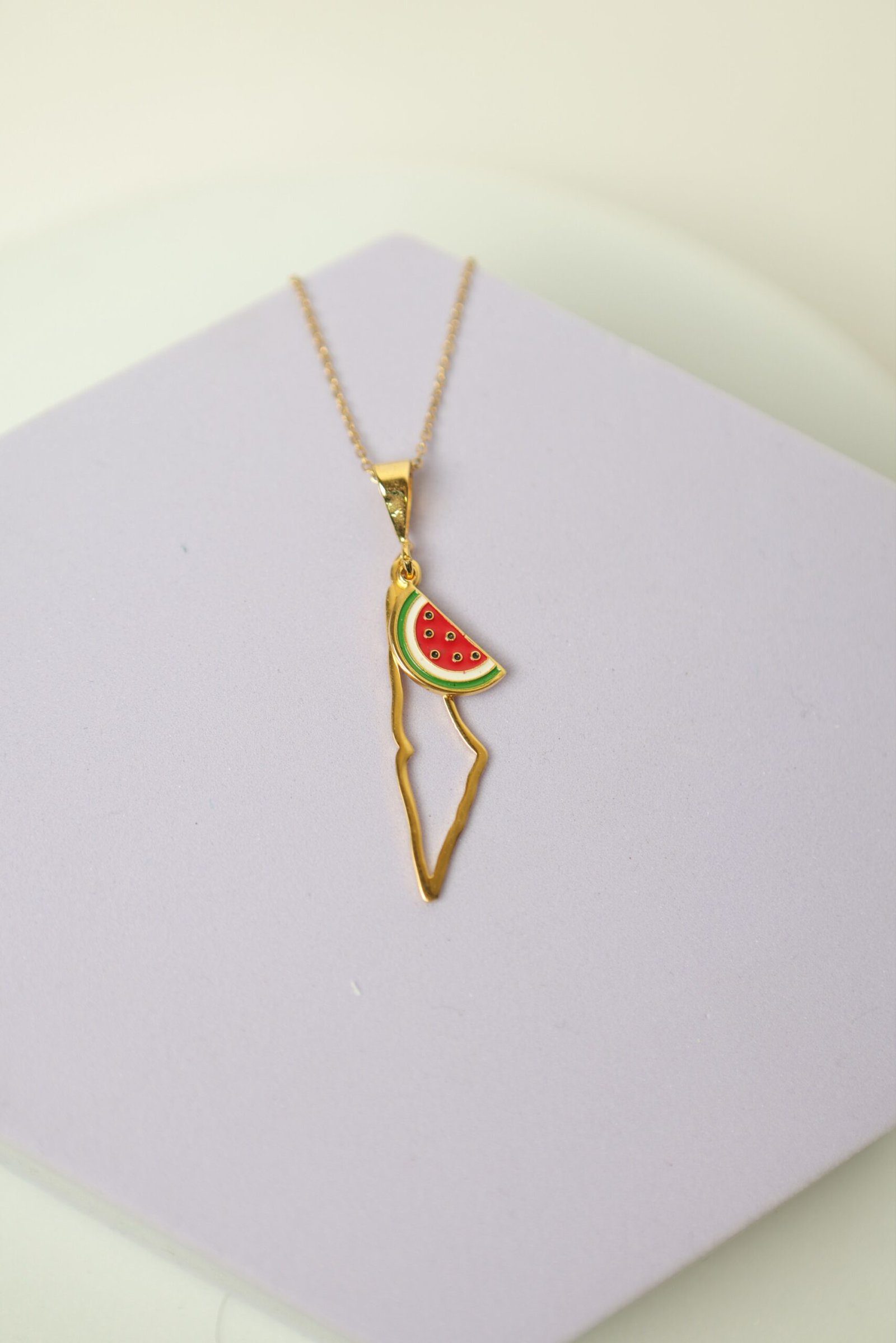 سنسال بقلادة ذهبية على شكل خريطة فلسطين ويظهر ايضاً شكل البطيخ وهو يرمز للمقاومة والهوية الفلسطينية