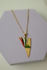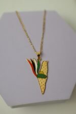سنسال بقلادة ذهبية على شكل خريطة فلسطين، مزينة بتصميم رمزي غني بالمعاني
