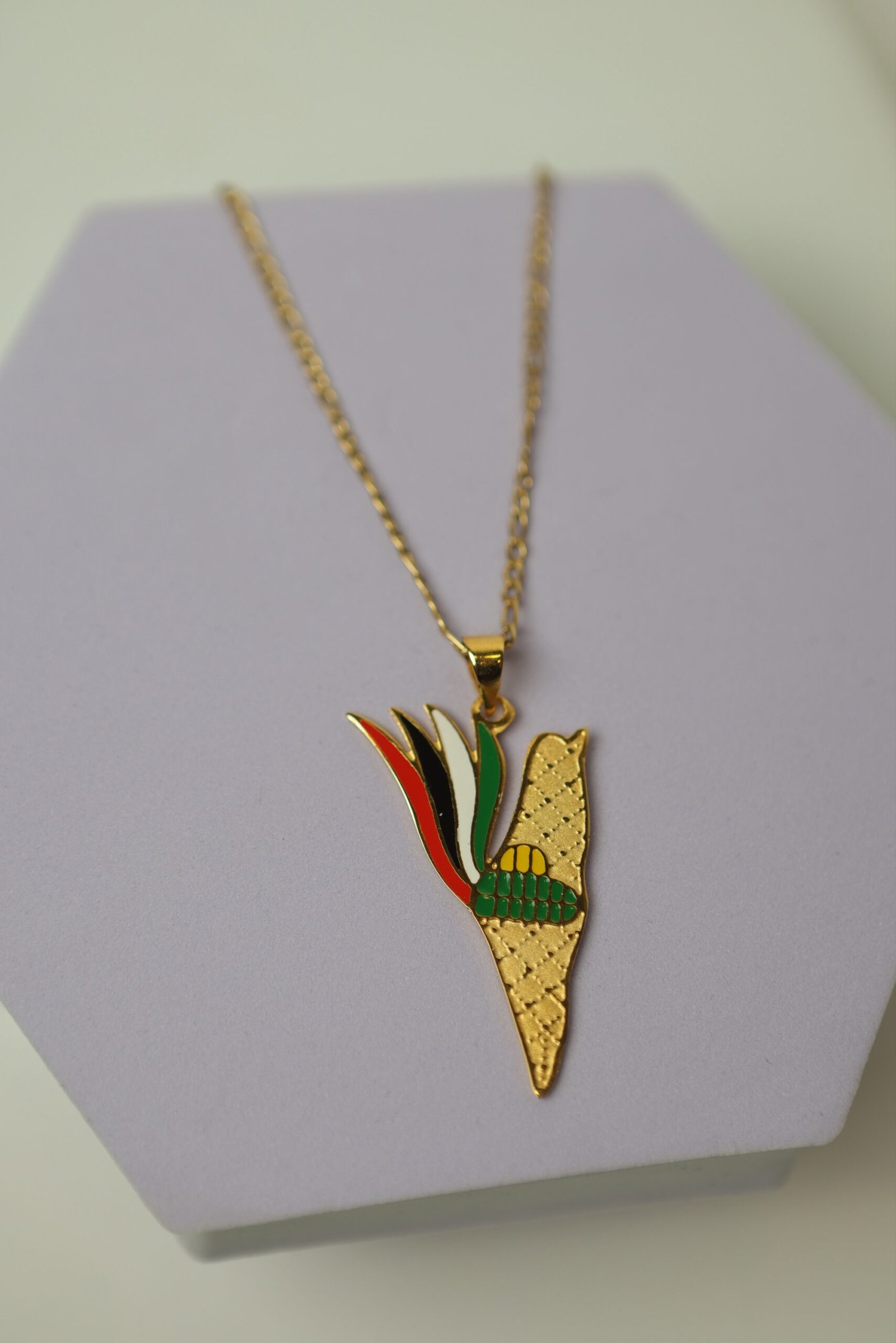 الجزء الأيسر من القلادة يحتوي على شكل لهب مكوّن من ألوان العلم الفلسطيني: الأحمر، الأبيض، الأسود، والأخضر، بينما يظهر في الجهة اليمنى نقش يمثل الكوفية الفلسطينية. في وسط القلادة، يبرز قبة الصخرة بلونها الذهبي والأخضر، ما يرمز إلى مدينة القدس. الخلفية بنفسجية فاتحة، مما يجعل تفاصيل القلادة واضحة وجذابة
