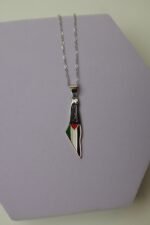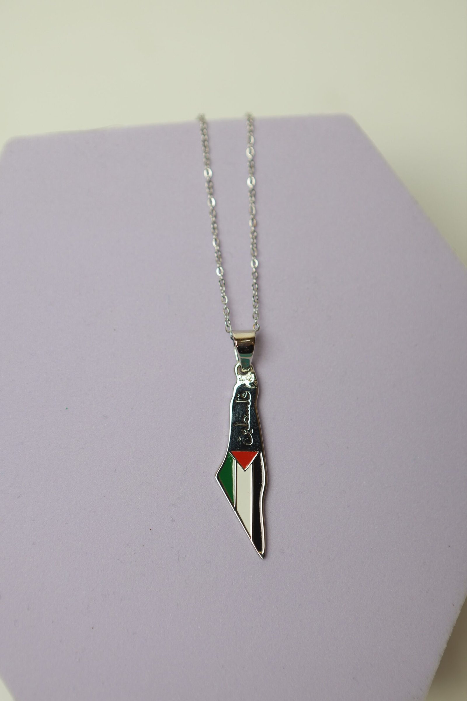 سنسال بقلادة فضية أنيقة على شكل خريطة فلسطين.