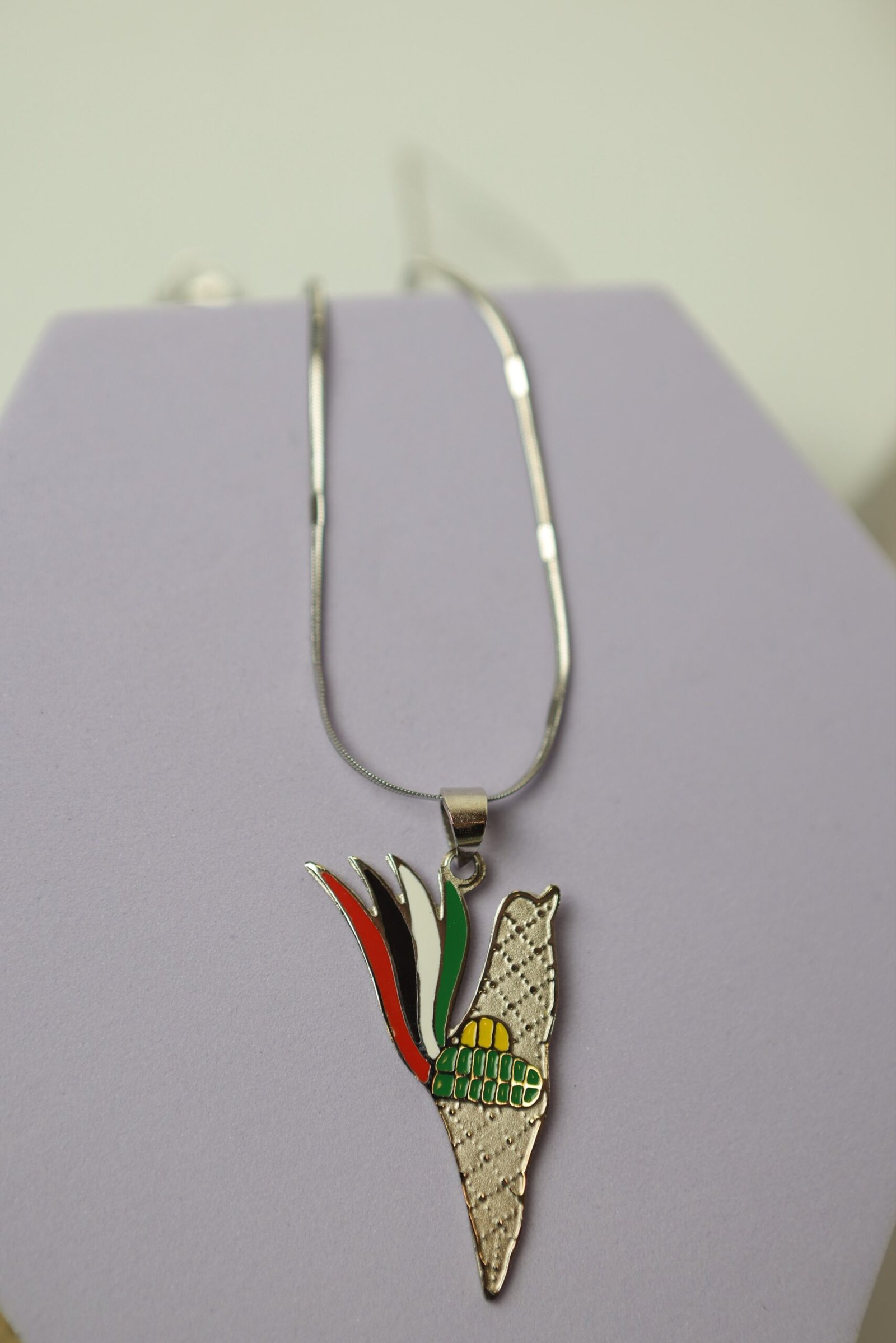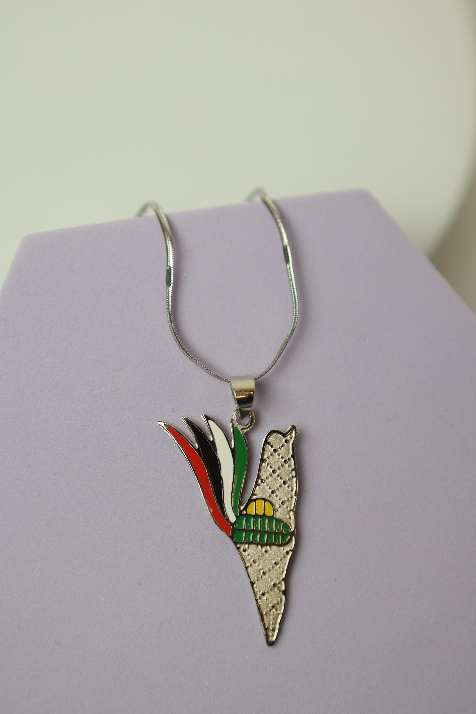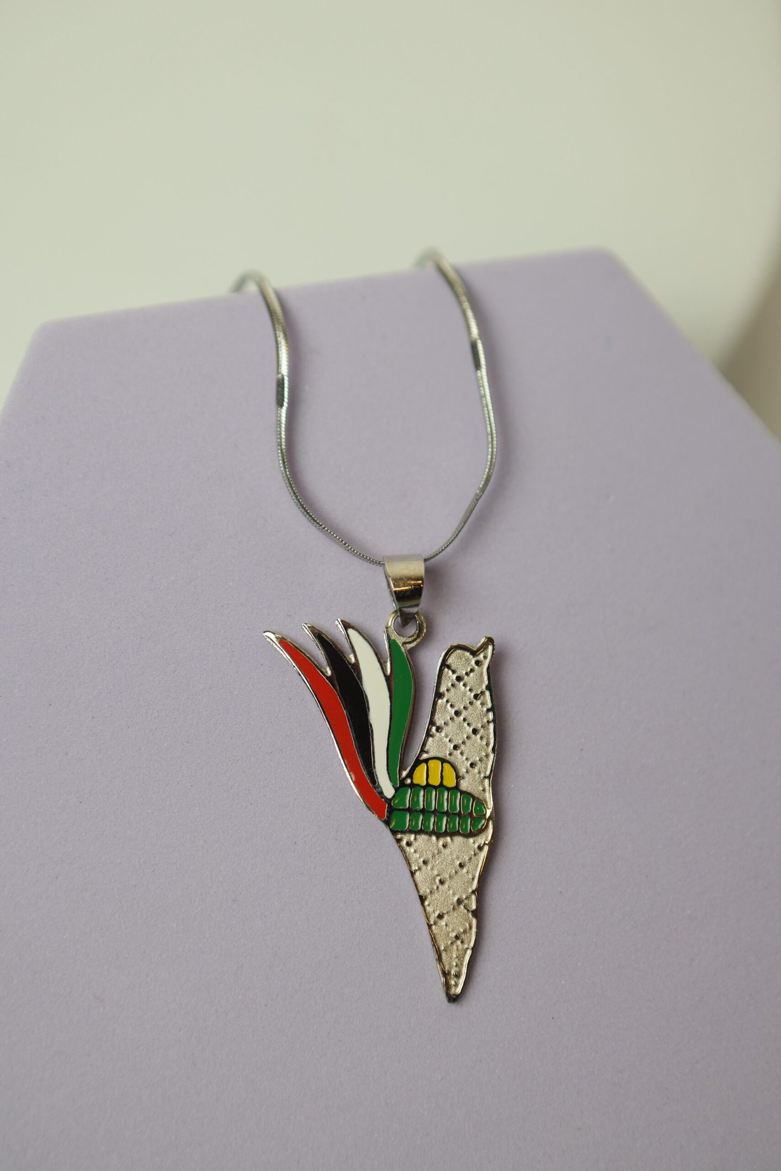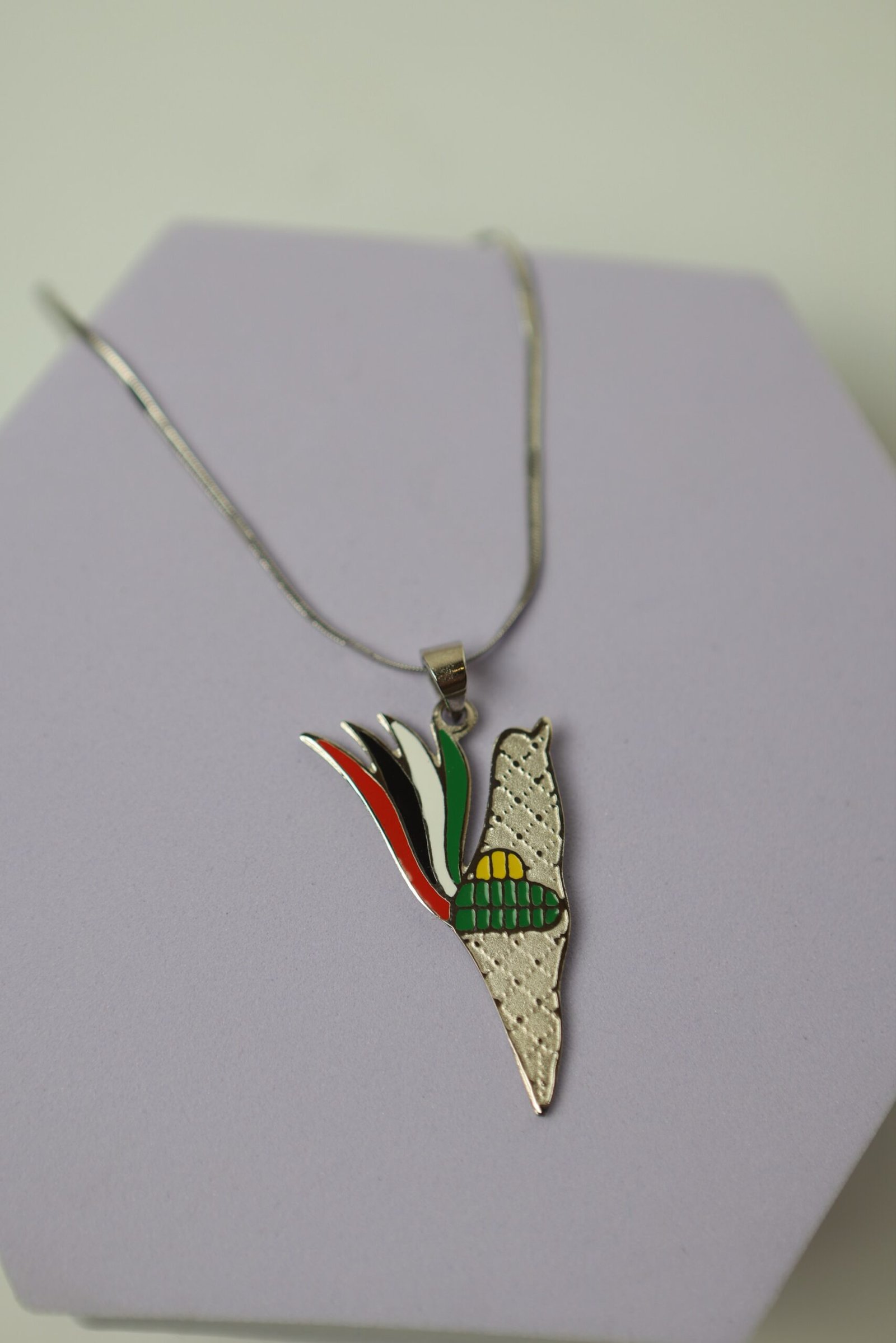 سنسال بقلادة فضية على شكل خريطة فلسطين، مزينة بتصميم رمزي غني بالمعاني. الجزء الأيسر من القلادة يحتوي على شكل لهب مكوّن من ألوان العلم الفلسطيني