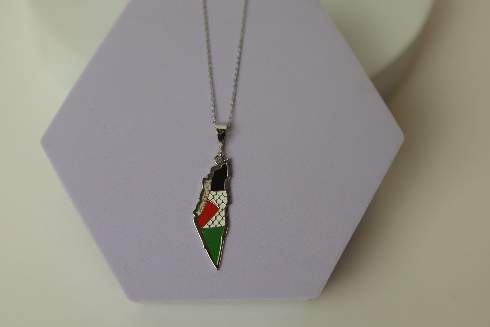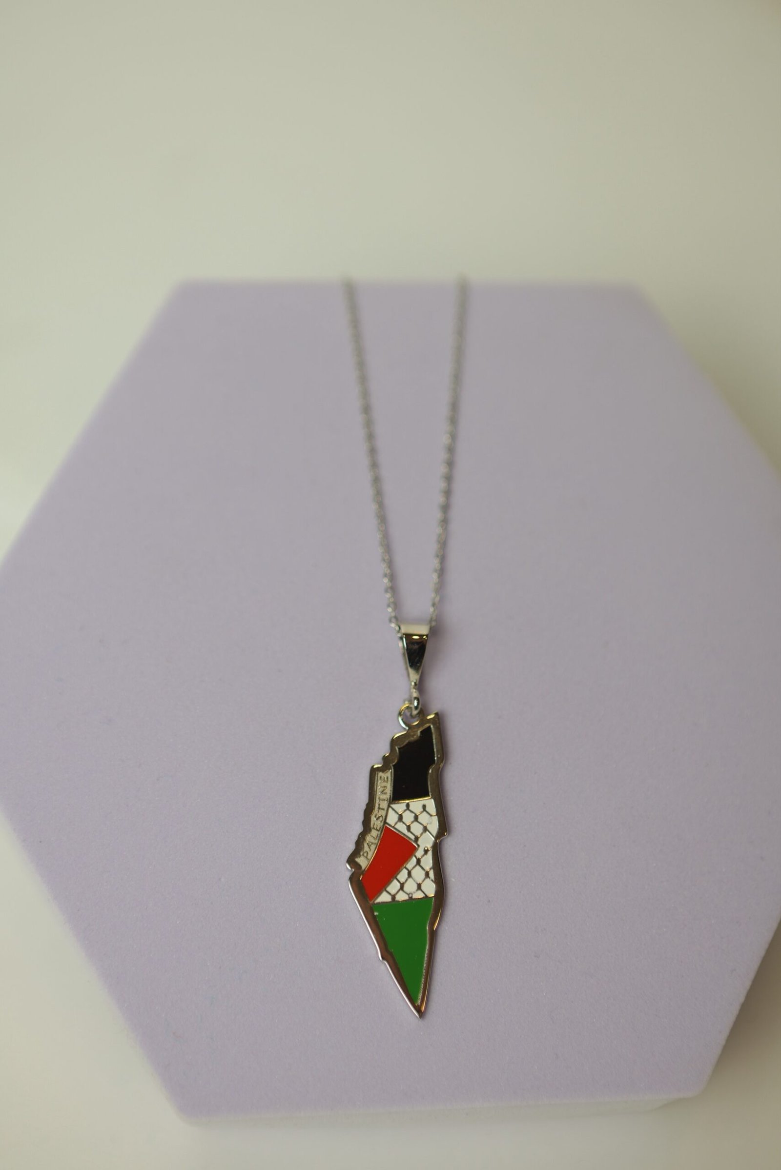 سنسال بقلادة فضية على شكل خريطة فلسطين، تتضمن عناصر رمزية غنية. التصميم الداخلي للخريطة مقسم إلى ألوان العلم الفلسطيني