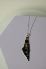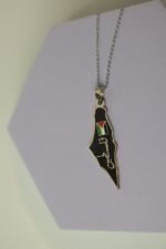 قلادة معلّقة بسلسلة فضية، صُممت على شكل خريطة فلسطين