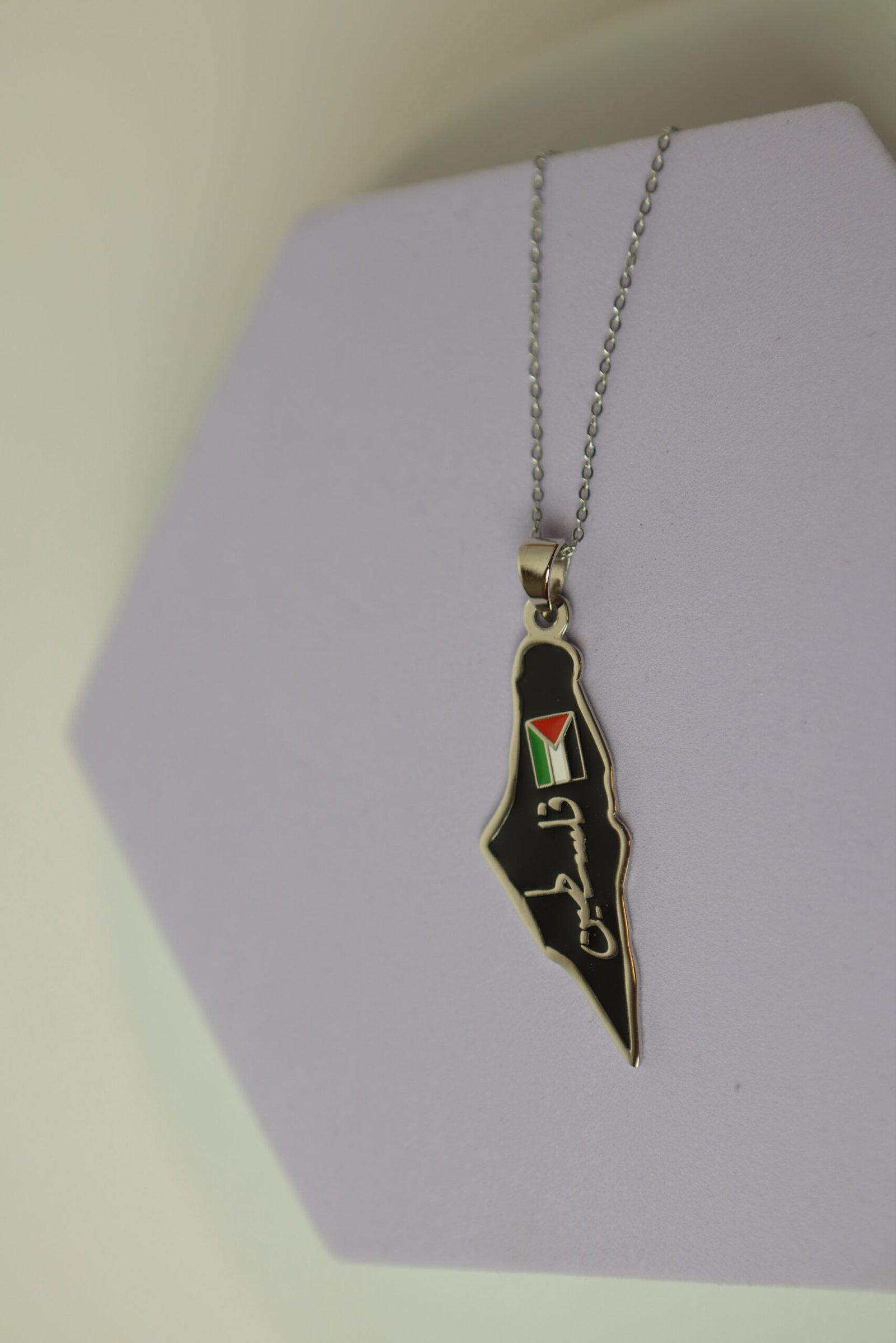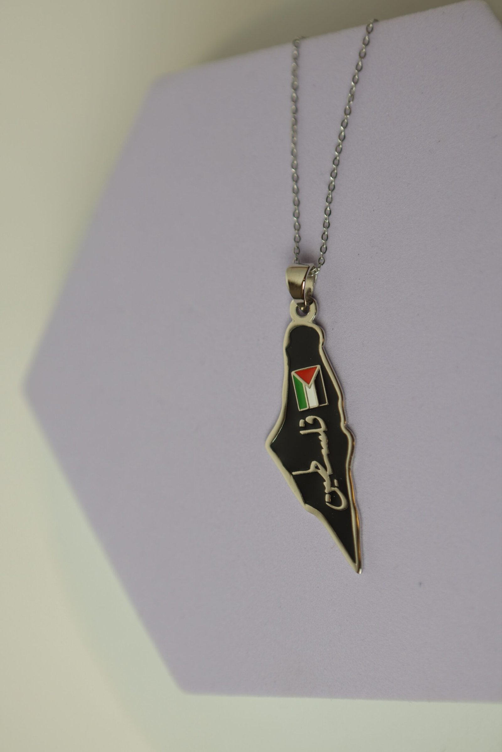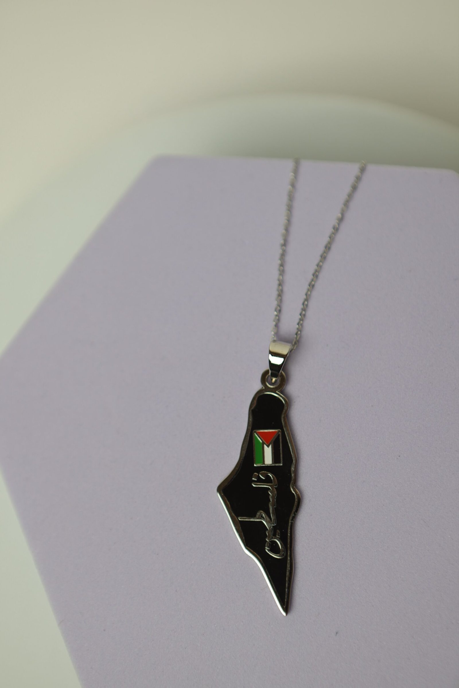 إلى جانب العلم، نُقشت كلمة “فلسطين” بالخط العربي الفضي. السلسلة فضية رفيعة، والخلفية باللون البنفسجي الفاتح، مما يُبرز تفاصيل القلادة بشكل جذاب وواضح