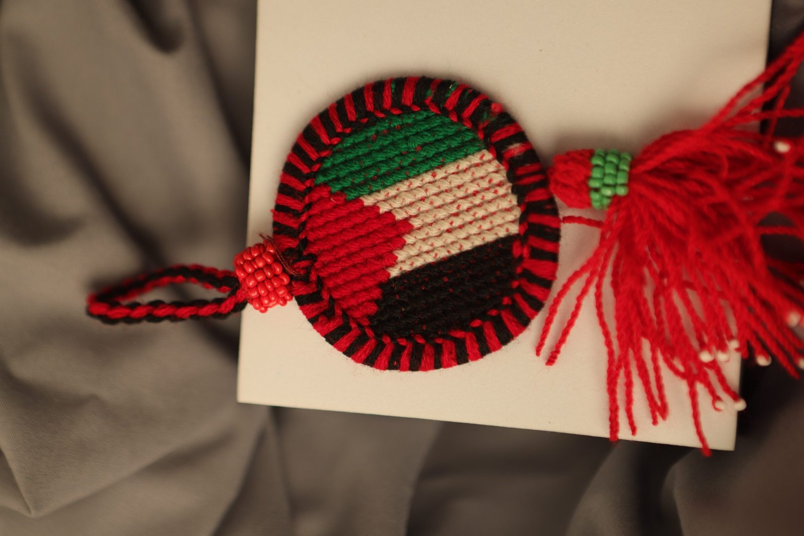 قطعة دائرية فنية يدوية ، منسوجة بخيوط تمثل ألوان العلم الفلسطيني