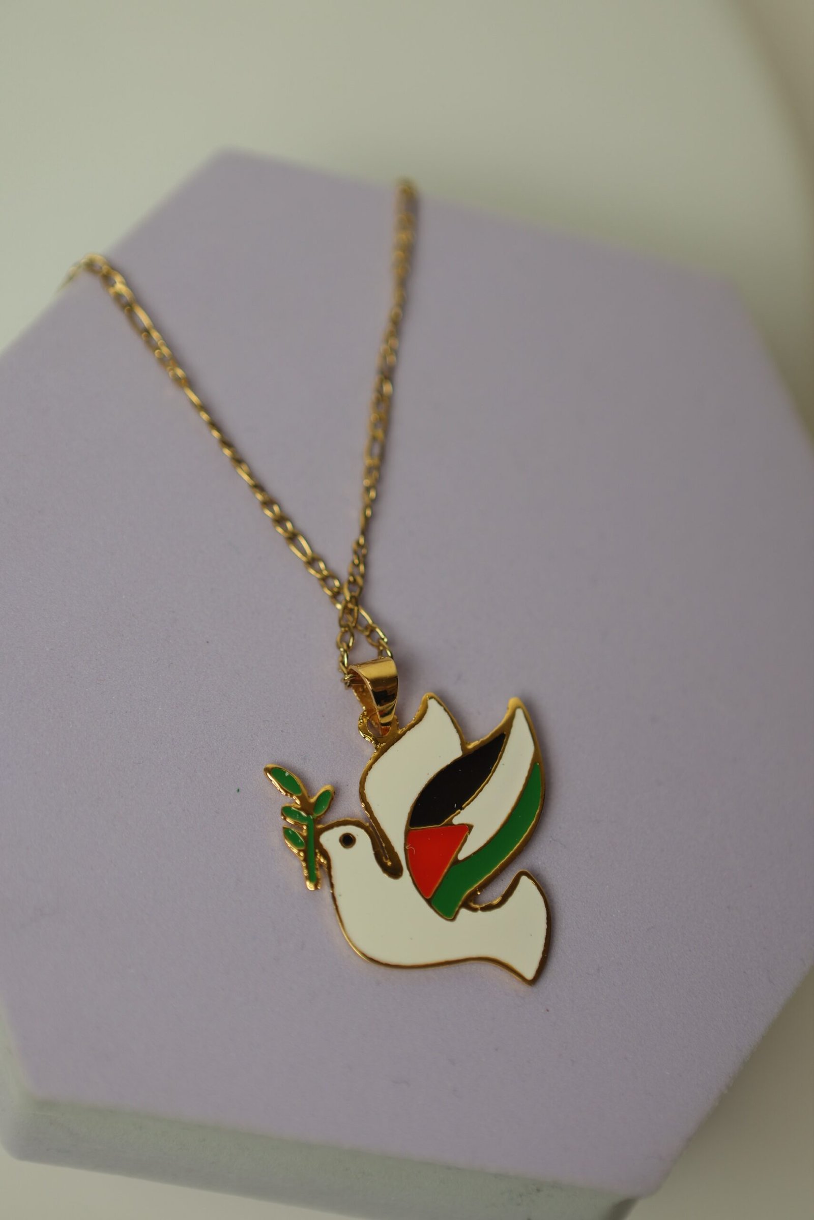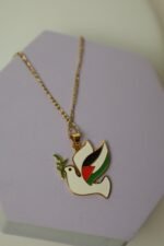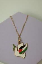 قلادة ذهبية على شكل حمامة بيضاء، وهي ترمز إلى السلام. تحمل الحمامة غصن زيتون أخضر في منقارها، بينما أُضيف إلى جناحها ألوان العلم الفلسطيني: الأحمر، الأسود، الأبيض، والأخضر. السلسلة رفيعة ذهبية اللون، والخلفية بنفسجية فاتحة تُبرز تفاصيل القلادة بشكل جميل وواضح