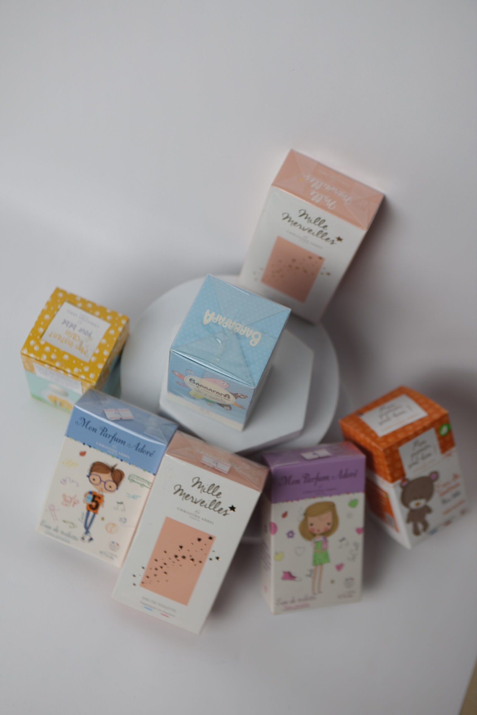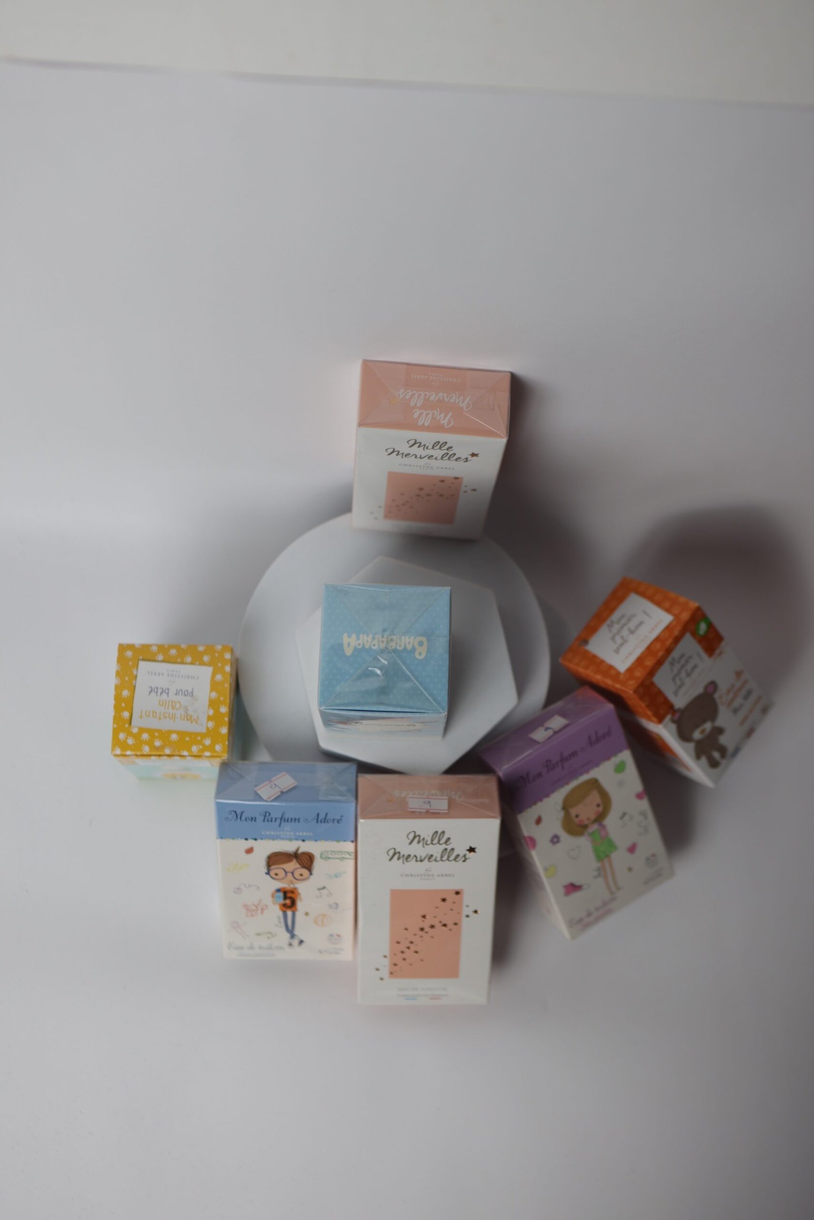 مجموعة من علب العطور الملونة والمرسومة بطريقة جذابة ومخصصة للأطفال أو الفئة الشابة.